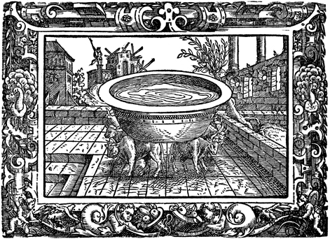 Description: The bronze sea made by Solomon for the temple, including the twelve cast oxen supporting the sea, with three each facing north, south, east, and west.