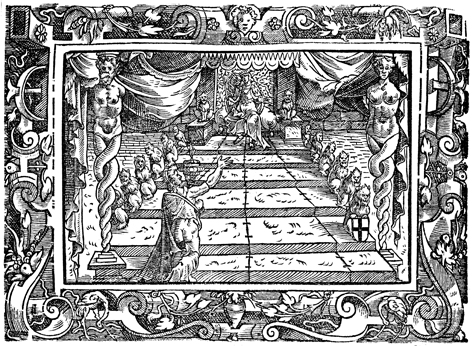 Description: Solomon sits enthroned at the top of a staircase lined with lion statues.