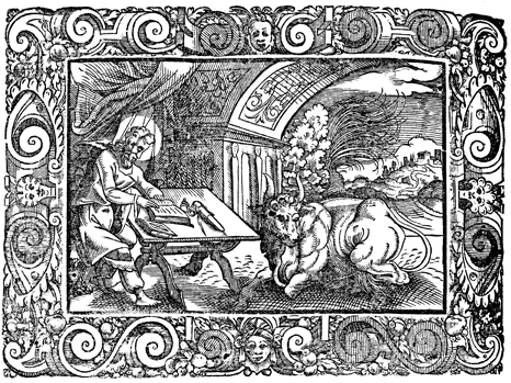 Description: Saint Luke the Evangelist writing the book of Acts with his attribute, the ox or bull.
