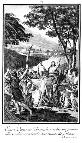 Description: Jesus enters Jerusalem on a donkey to the waving of palm branches and the placing of cloaks on the ground. The engraver’s name is located at the lower right corner.