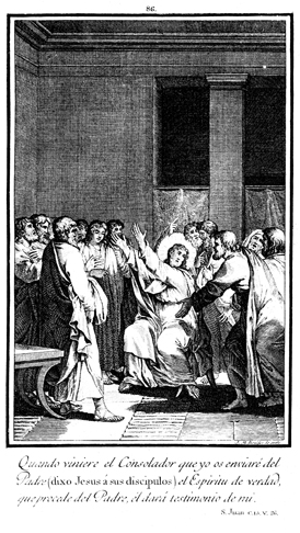 Description: Jesus says to his disciples “But when the Helper comes, whom I shall send to you from the Father, the Spirit of truth who proceeds from the Father, he will testify of me” (John 15:26). The engraver’s name is located at the lower right corner.
