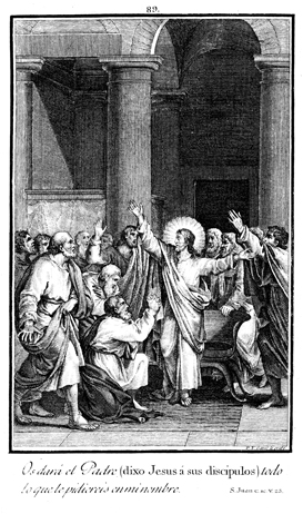 Description: Jesus teaches his disciples that whatever they ask the Father in his name will be given to them (John 16:23). The engraver’s name is located at the lower right corner.