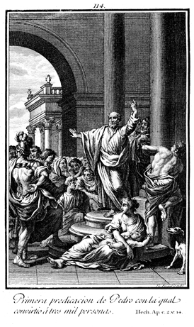 Description: Peter preaches a sermon on Pentecost. The engraver’s name is located at the lower right corner.