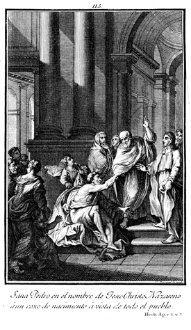 Description: Peter and John heal the lame man who would beg for alms at the Beautiful Gate of the temple. The engraver’s name is located at the lower right corner.