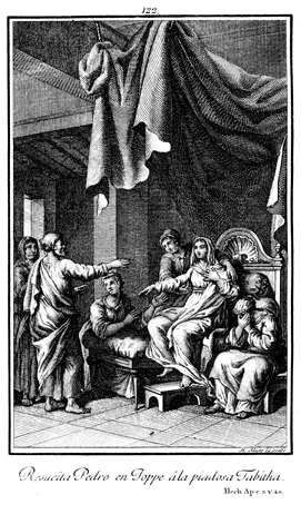 Description: Peter raises Tabitha from the dead in Joppa. The engraver’s name is located at the lower right corner.