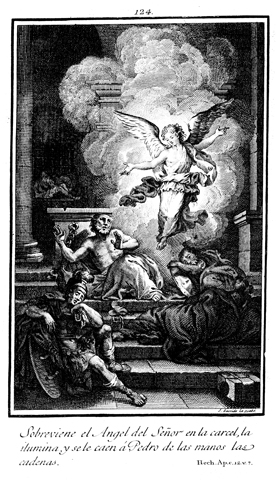 Description: An angel helps Peter escape from prison during the night. The engraver’s name is located at the lower right corner.