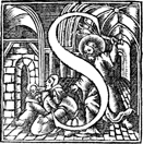 Description: An initial letter S depicting Jesus driving the merchants from the temple.