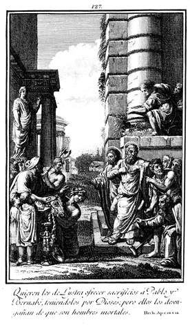 Description: Paul and Barnabas are mistaken for the Greek gods Hermes and Zeus respectively. A priest of Zeus is shown bringing an ox and garlands to sacrifice to Paul and Barnabas, at which point Paul and Barnabas tear their clothes and plead with the crowd to not worship them, but rather the living God. The engraver’s name is located at the lower right corner.