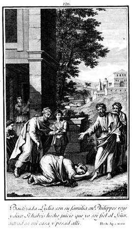 Description: After baptizing Lydia and her family, Lydia pleads with Paul to stay at her home. The engraver’s name is located at the lower right corner.