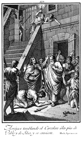 Description: The Apostle Paul and Silas were imprisoned at Philippi. When the Philippian jailor finds that they had not escaped, even after being freed by an earthquake, he asks them what he must do to be saved. The engraver’s name is located at the lower right corner.