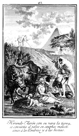 Description: Aaron strikes the dust of the land with his rod and brings forth a plague of gnats that trouble both human and beast.
