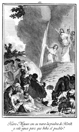 Description: Moses brings water from the rock at Meribah by following God’s command to strike the rock with the staff he used at the Nile.