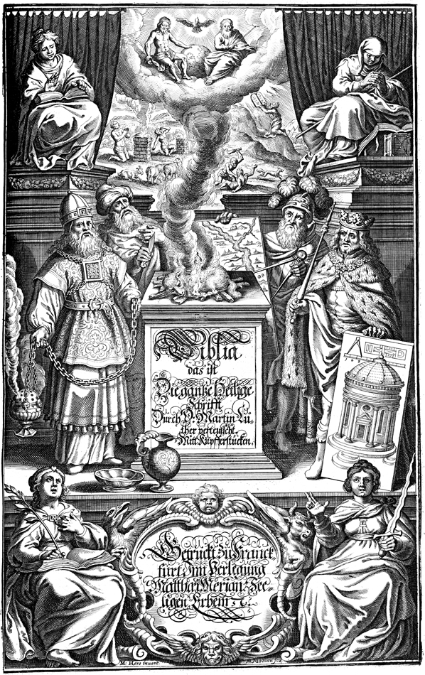 Description: This frontispiece features a collection of images from the Old and New Testaments. At the base, two women flank an inscription surrounded by the four figures representing the Gospel writers (winged ox, lion, eagle, and man). In the center, a lamb is sacrificed as a burnt offering while figures from the Old Testament bracket the altar (Aaron and Abraham on the left and possibly King David and King Solomon on the right). At the head, two women flank an image of the Trinity, which appears in the smoke made by the offering. In the background are scenes from the Old Testament, such as Moses receiving the Ten Commandments and Cain slaying Abel. Engraved by Matthaeus Merian (1593-1650).