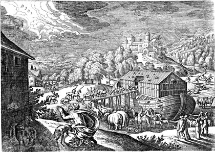 Description: God, indicated by the Tetragrammaton in the upper left corner, speaks to Noah, as the animals begin entering the ark two by two. In the background, the people live in revelry and sin. Engraved by Matthaeus Merian (1593-1650).