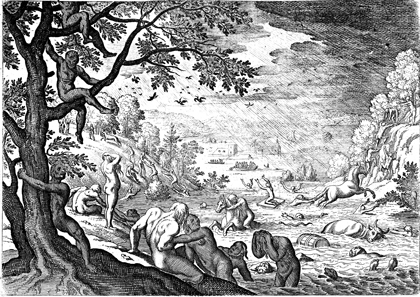 Description: The ark protects those inside (background), while others try to escape the rising floodwaters. Engraved by Matthaeus Merian (1593-1650).