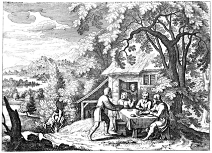 Description: Abraham serves the three angels a meal beneath the great tree of Mamre, and Sarah stands in the doorway listening, as the angels inform Abraham of God’s plan to bless him with a son through Sarah. Engraved by Matthaeus Merian (1593-1650).