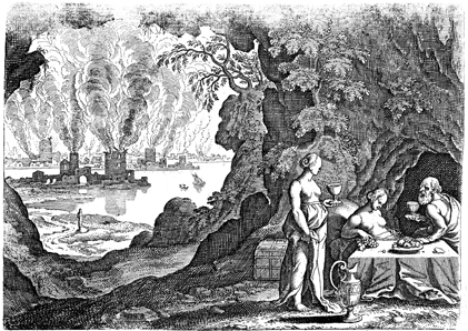 Description: Lot’s daughters seduce him after getting him drunk, while Sodom and Gomorrah burn (background). Lot’s wife is depicted as a pillar of salt. Engraved by Matthaeus Merian (1593-1650).