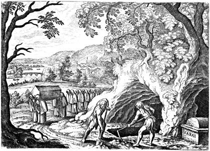 Description: Isaac and Ishmael bury Abraham in the cave of Machpelah next to his wife Sarah. Engraved by Matthaeus Merian (1593-1650).