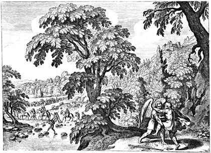 Description: After Jacob sends his family ahead of him (left), an angel appears to Jacob and wrestles with him throughout the night. Engraved by Matthaeus Merian (1593-1650).