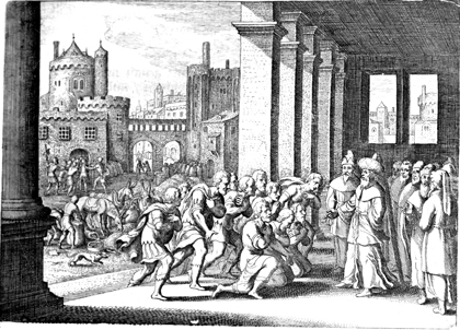 Description: Joseph conceals his identity from his brothers and accuses them of being spies, as they kneel before him and request grain during an intense famine, and Joseph tests his brothers by imprisoning them for three days (background). Engraved by Matthaeus Merian (1593-1650).