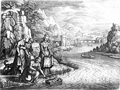 Description: The daughter of Pharaoh finds Moses in a papyrus basket among the reeds along the riverbank. Engraved by Matthaeus Merian (1593-1650).