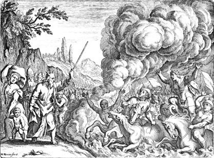 Description: As Moses and Israel stand safely on the shore, Pharaoh's army drowns in the Red (Reed) Sea. Engraved by Matthaeus Merian (1593-1650).