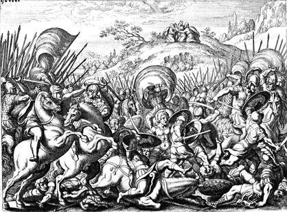Description: Aaron and Hur hold up Moses' hands, enabling Joshua to defeat the Amalekites. Engraved by Matthaeus Merian (1593-1650).