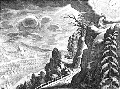 Description: With Israel in the background, God speaks to Moses from a cloud of smoke and fire at Mount Sinai. God’s presence is illustrated by the tetragrammaton (top right). Engraved by Matthaeus Merian (1593-1650).