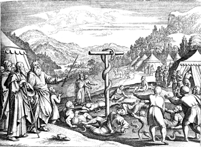 Description: Moses provides a bronze serpent so that whoever looks upon it may survive the venomous snake bites. Engraved by Matthaeus Merian (1593-1650).