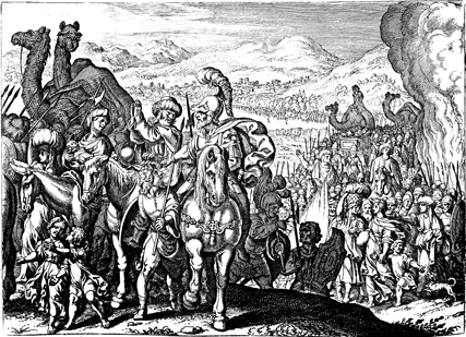 Description: The Israelites cross the Jordan River as the priests hold the Ark of the Covenant in the middle of the river. Engraved by Matthaeus Merian (1593-1650).