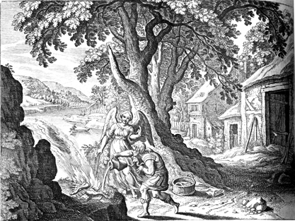 Description: By igniting an offering on fire, the Angel of the Lord proves his identity to Gideon, whom he commissions to deliver Israel from Midian. Engraved by Matthaeus Merian (1593-1650).