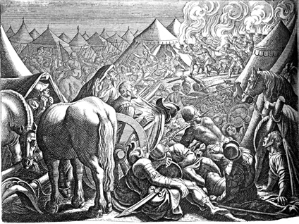 Description: Gideon and the Israelite army defeat the Midianites at night. Engraved by Matthaeus Merian (1593-1650).
