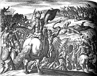 Description: David takes Goliath's sword in order to decapitate him after striking him with a stone from his sling. Engraved by Matthaeus Merian (1593-1650).