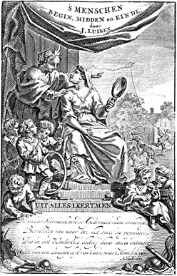 Description: Below the title, a woman representing the desire to learn sits on a pedestal with a mirror in her hand that reflection the actions of the children who surround her. She is listening to another woman, representing Piety, who stands behind her and points to the heavens. At her feet is the description UIT ALLES LEERTMEN, meaning “one learns from everything”.