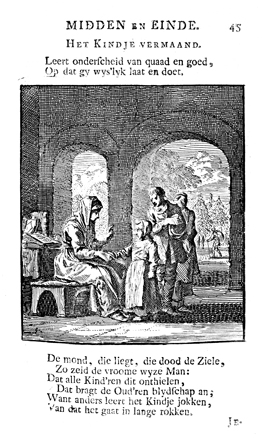 Description: A mother admonishes her child, as two older children watch. The Dutch artist and poet Jan Luiken (1649-1712) was responsible for drawing and etching this emblem and for the brief poem that accompanies it (below). The attendant Scripture texts are Ps 5:6; Pvb 12:17-19; 13:1-4; and 20:17.