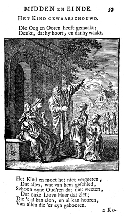 Description: The father points at the sky and addresses two children before him, while the mother with infant sits nearby. In the background a family with young children watches a stork sitting on her nest on a church roof. The Dutch artist and poet Jan Luiken (1649-1712) was responsible for drawing and etching this emblem and for the brief poem that accompanies it (below). The attendant Scripture texts are Ps 11:4-5; 26:2; 33:13-15; 94:8-11; Pvb 15:3; and 17:3.
