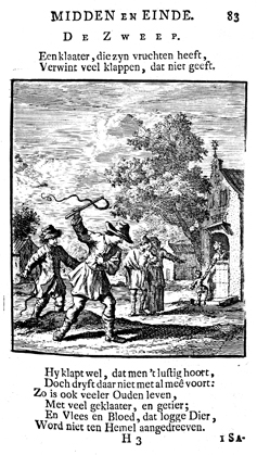 Description: Two youths crack their whips, while a woman looks out over the bottom of her Dutch door, while restraining her little boy. A couple comments on this scene. The Dutch artist and poet Jan Luiken (1649-1712) was responsible for drawing this emblem (Pieter Sluiter etched it) and for composing the brief poem that accompanied it (below). The attendant Scripture texts are Isa 29:13-14; Jer 7:3-4; 1 Tim 6:20-21 and James 1:26-27.