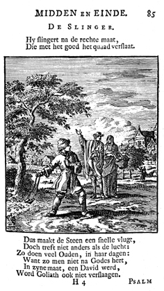 Description: Next to a small lake with a pair of swans, a youth is about to shoot a stone with his slingshot, while a couple comments on this scene set in an orchard. The Dutch artist and poet Jan Luiken (1649-1712) was responsible for drawing and etching this emblem (Pieter Sluiter [1675-1713] finished the background) and for the brief poem that accompanies it (below). The attendant Scripture texts are 1 Sam 17:37; Rom 12:21; 1 Cor 9:25-27; James 4:7 and 1 Pet 5:8-11.
