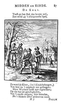 Description: In a winter landscape, a youth aims his golf club at a ball, while his friend awaits his turn, and two warmly dressed men look on. In the right background a man is skating on the ice and smoke rises from one of the houses. The Dutch artist and poet Jan Luiken (1649-1712) was responsible for drawing and etching this emblem (though Pieter Sluiter [1675-1713] finished the background) and for the brief poem that accompanies it (below). The attendant Scripture texts are Psalm 19:12-15, 51:17; Joel 2:12-13; Matt 6:21, 12:35; and Luke 4:18.