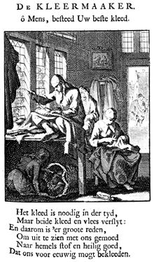 Description: Two tailors sew cross-legged on their work table in front of the window; a woman sits on a chair also sewing. A boy searches through a basket of scraps on the floor. The Dutch artist and poet Jan Luiken (1649-1712) was responsible for drawing this emblem and for creating the motto and poem that follow. Jan Luiken and/or his son Casper Luiken (1672-1708) were responsible for its etching. The attendant scripture text is Isaiah 61:10.