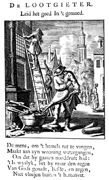 Description: The plumber uses bellows to heat the fire under the solder and soldering iron. A second worker on a ladder listens to the directions from a woman pointing to a problem area. In the background is a city scene with a woman carrying a pail of water into a house. The Dutch artist and poet Jan Luiken (1649-1712) was responsible for drawing this emblem and for creating the motto and poem that follow. Jan Luiken and/or his son Casper Luiken (1672-1708) were responsible for its etching. The attendant scripture text is Isaiah 45:8.