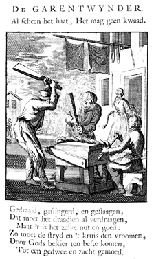 Description: In front of a house, two men are pounding fibers as a third man twists them. From the upper window hang pieces of fabric and hanks of fiber. The Dutch artist and poet Jan Luiken (1649-1712) was responsible for drawing this emblem and for creating the motto and poem that follow. Jan Luiken and/or his son Casper Luiken (1672-1708) were responsible for its etching. The attendant scripture text is 2 Corinthians 4:16-18.