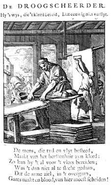 Description: The nap shearer shears a bolt of woolen fabric. Bolts of fabric are carried into the workshop to be hung and treated with teasing combs. The Dutch artist and poet Jan Luiken (1649-1712) was responsible for drawing this emblem and for creating the motto and poem that follow. Jan Luiken and/or his son Casper Luiken (1672-1708) were responsible for its etching. The attendant scripture text is Genesis 3:21.
