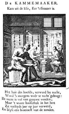 Description: Three comb makers are at work in a small workshop while a woman watches. A number of ivory tusks lie on the floor and combs hang from the open shutters. The Dutch artist and poet Jan Luiken (1649-1712) was responsible for drawing this emblem and for creating the motto and poem that follow. Jan Luiken and/or his son Casper Luiken (1672-1708) were responsible for its etching. The attendant scripture text is Psalm 40:11-13 though Luiken quotes Psalm 40:12-14.