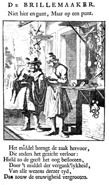 Description: In front of the optician’s store, a man tries out a pair of eyeglasses by reading a passage from a book. The optician stands next to him; several eyeglasses and telescopes are displayed on and from the opened shutters. The Dutch artist and poet Jan Luiken (1649-1712) was responsible for drawing this emblem and for creating the motto and poem that follow. Jan Luiken and/or his son Casper Luiken (1672-1708) were responsible for its etching. The attendant scripture text is Matthew 13:13-17.