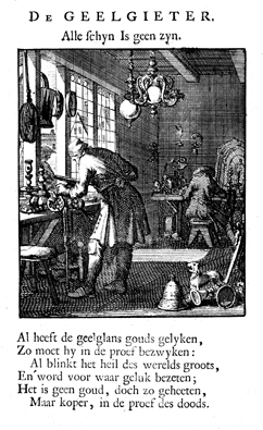 Description: Standing at his work-bench, the brass smith files the edges of the arms for a chandelier. A second man works in the background. On the ceiling hangs a chandelier and on the floor are several objects waiting to be finished. The Dutch artist and poet Jan Luiken (1649-1712) was responsible for drawing this emblem and for creating the motto and poem that follow. Jan Luiken and/or his son Casper Luiken (1672-1708) were responsible for its etching. The attendant scripture text is Luke 12:19-21.