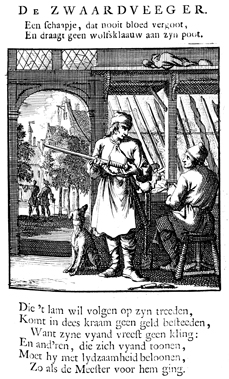 Description: In his shop, the sword smith discusses the sharpness of the blade of a sword held by a man standing next to him, while the man’s dog watches attentively. Outside two men with swords hanging from their belts stand along a tree-lined street. The Dutch artist and poet Jan Luiken (1649-1712) was responsible for drawing this emblem and for creating the motto and poem that follow. Jan Luiken and/or his son Casper Luiken (1672-1708) were responsible for its etching. The attendant scripture text is Matthew 5:38-39.
