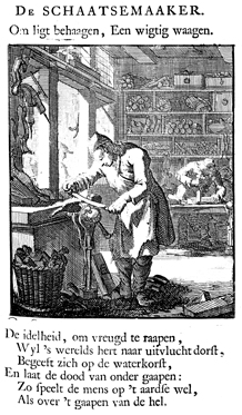 Description: In the foreground of the workshop, a skate maker is finishing the rounded wooden body of a skate and a second worker uses a chisel to begin the shaping of the wood block. Finished skates and tools hang on the wall, and supplies are stacked on the back shelves. The Dutch artist and poet Jan Luiken (1649-1712) was responsible for drawing this emblem and for creating the motto and poem that follow. Jan Luiken and/or his son Casper Luiken (1672-1708) were responsible for its etching. The attendant scripture text is Job 37:10.