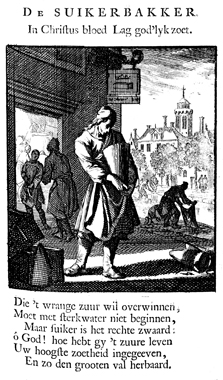 Description: The sugar refiner steps outside carrying a large sugar loaf, of which several lie already on the foreground; behind him three other workmen. Two workmen wash fabric in the canal; a church is situated on the other side of the canal. The Dutch artist and poet Jan Luiken (1649-1712) was responsible for drawing this emblem and for creating the motto and poem that follow. Jan Luiken and/or his son Casper Luiken (1672-1708) were responsible for its etching. The attendant scripture text is Proverbs 16:24.