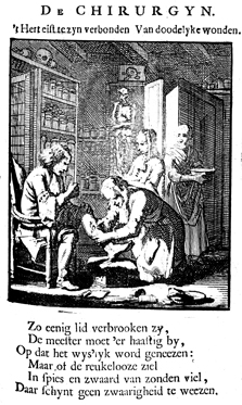 Description: An injured young man, clearly in pain, sits on a chair in the surgery while his leg is being examined by the surgeon kneeling in front of him; behind the surgeon a servant boy and a maid carry a bowl each. A cabinet with a skull on top is full of jars; a skeleton hangs in a second cabinet. The Dutch artist and poet Jan Luiken (1649-1712) was responsible for drawing this emblem and for creating the motto and poem that follow. Jan Luiken and/or his son Casper Luiken (1672-1708) were responsible for its etching. The attendant scripture text is Isaiah 1:4-6.